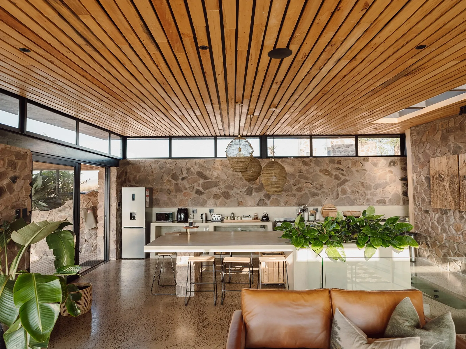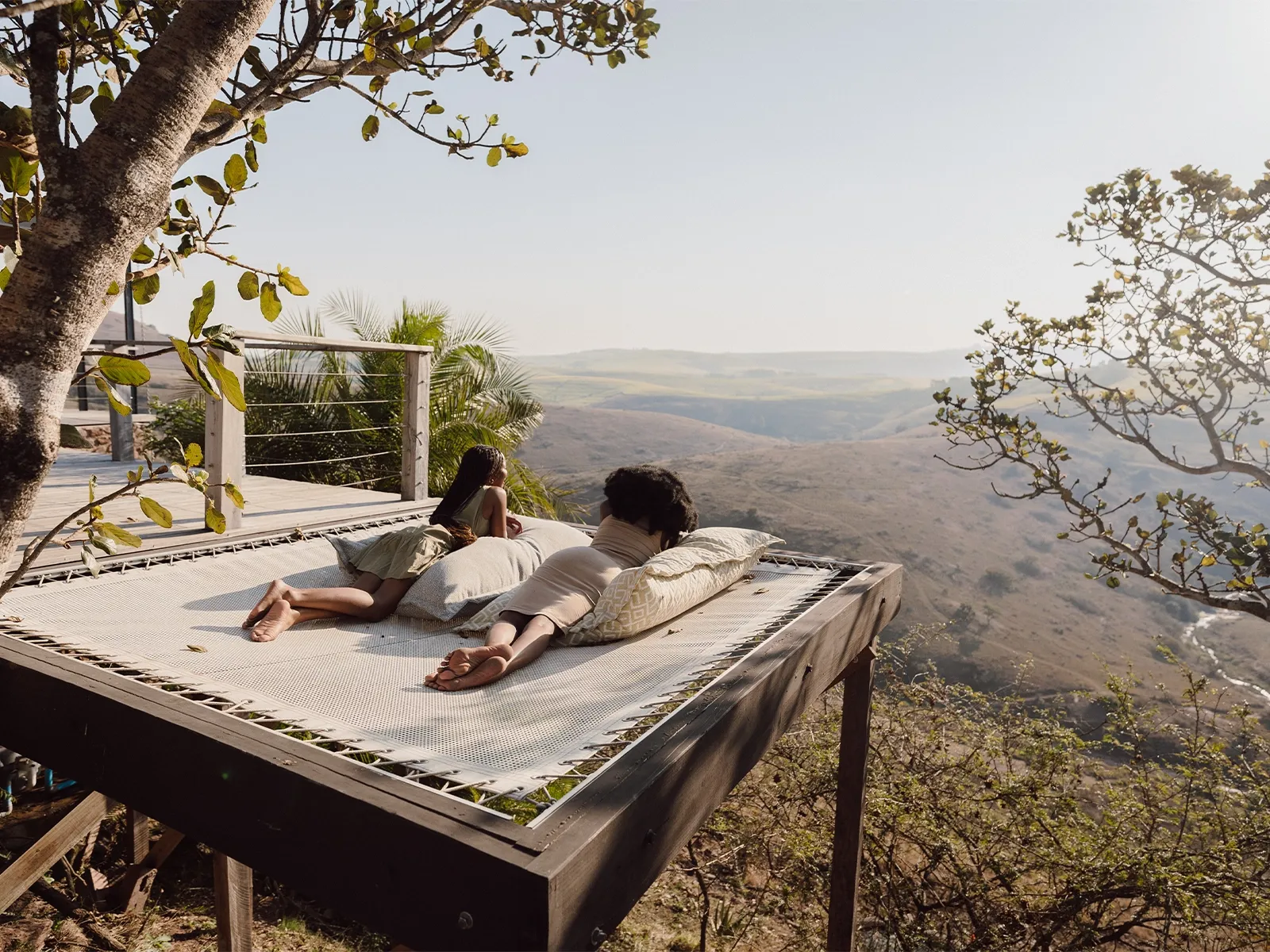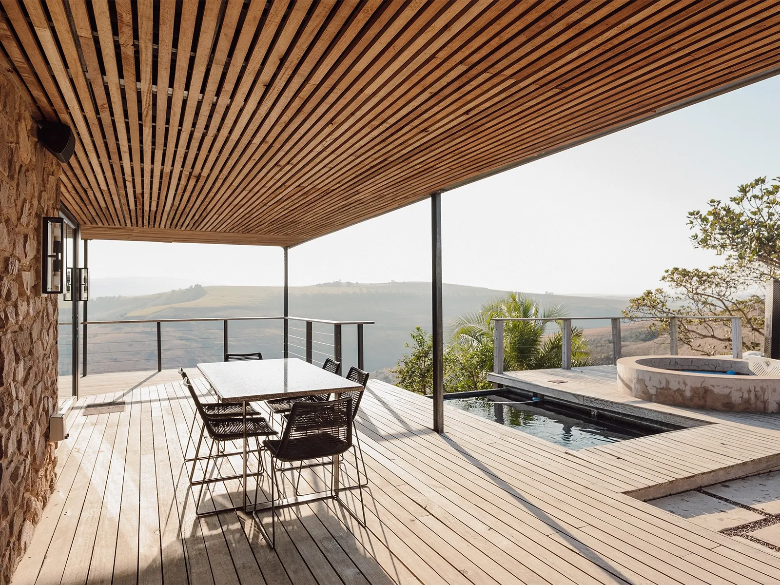 Riverbend is built into the mountainside, with panoramic verandas, an open living area with large kitchen and comfortable lounge, infinity pool, large cargo net extending from the deck and striking boma area.